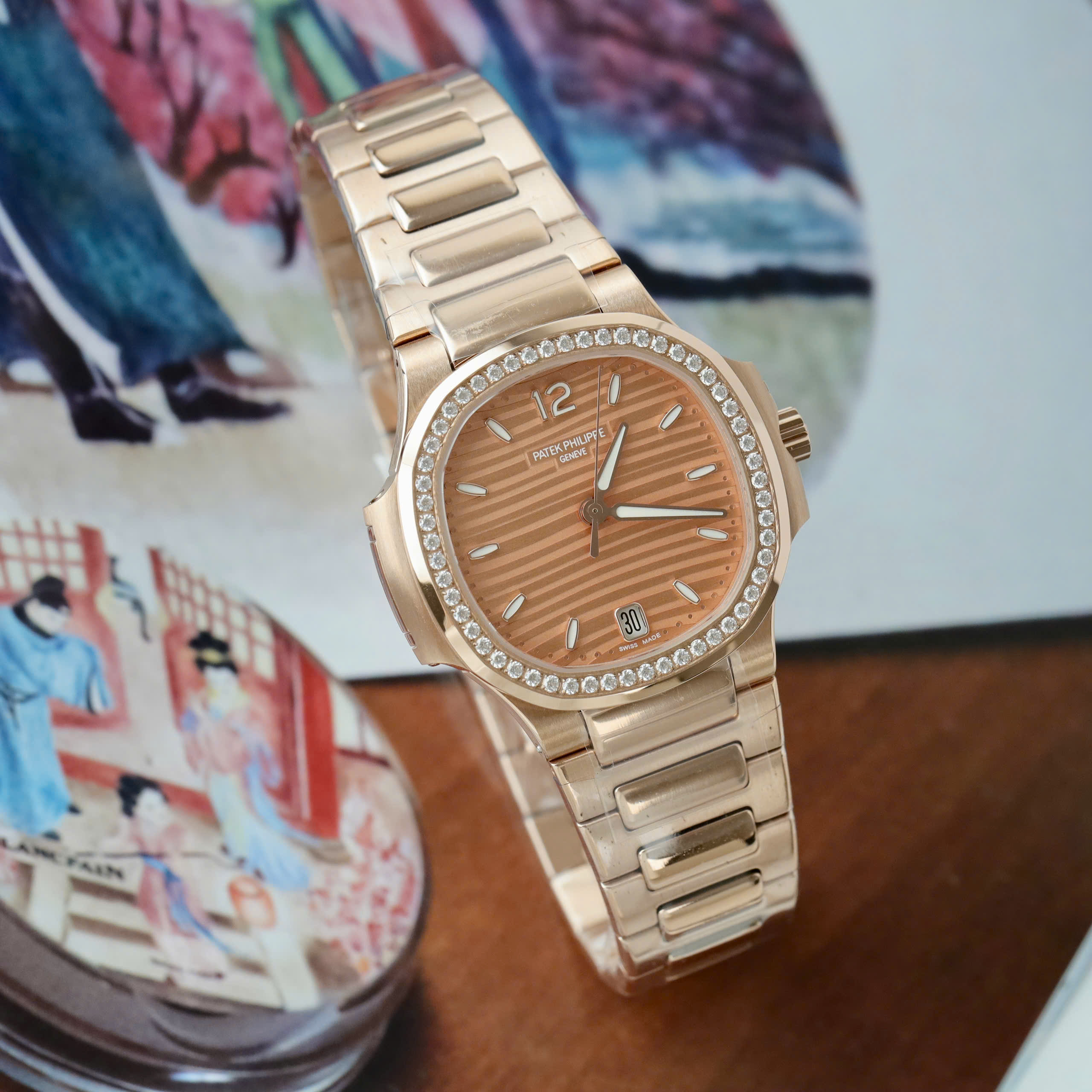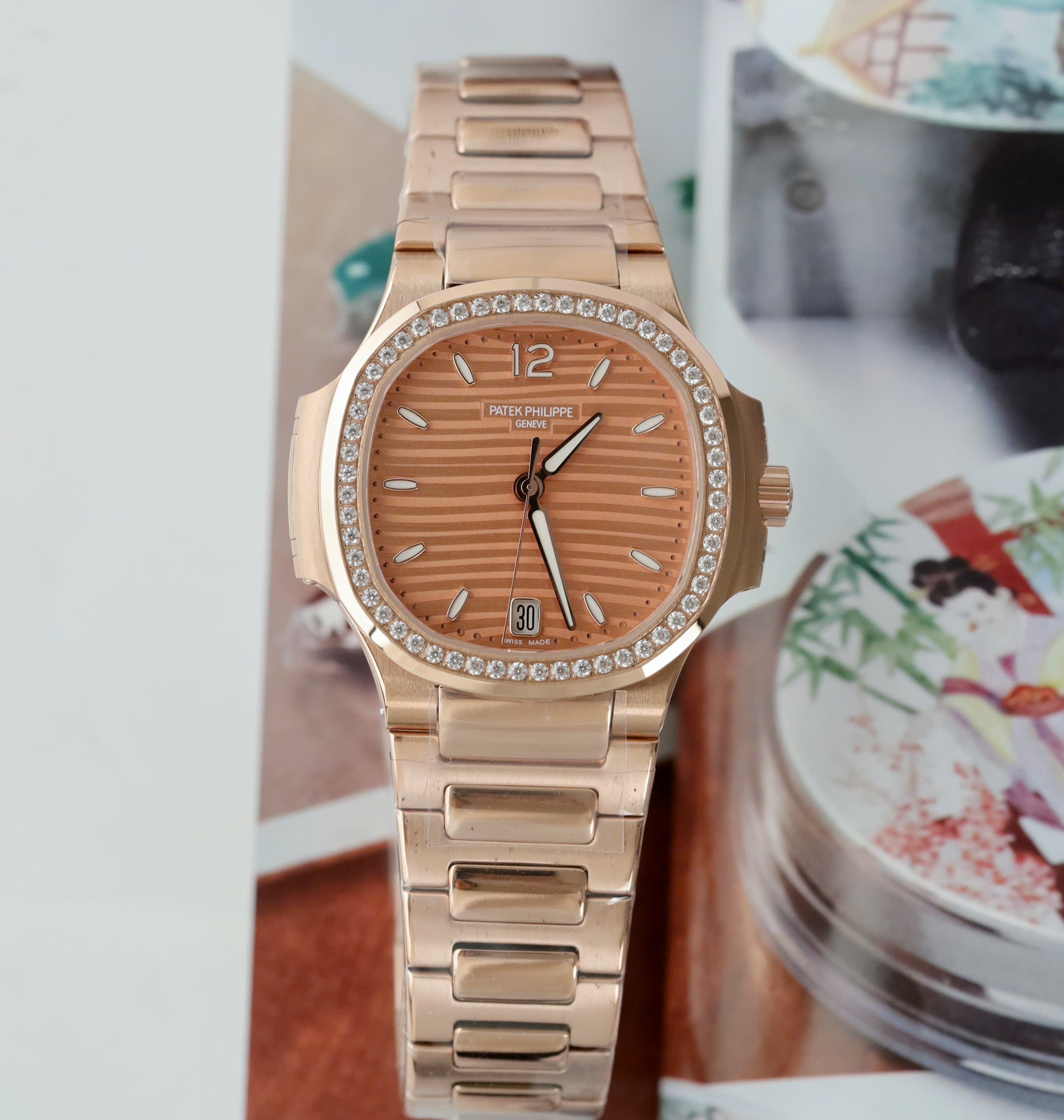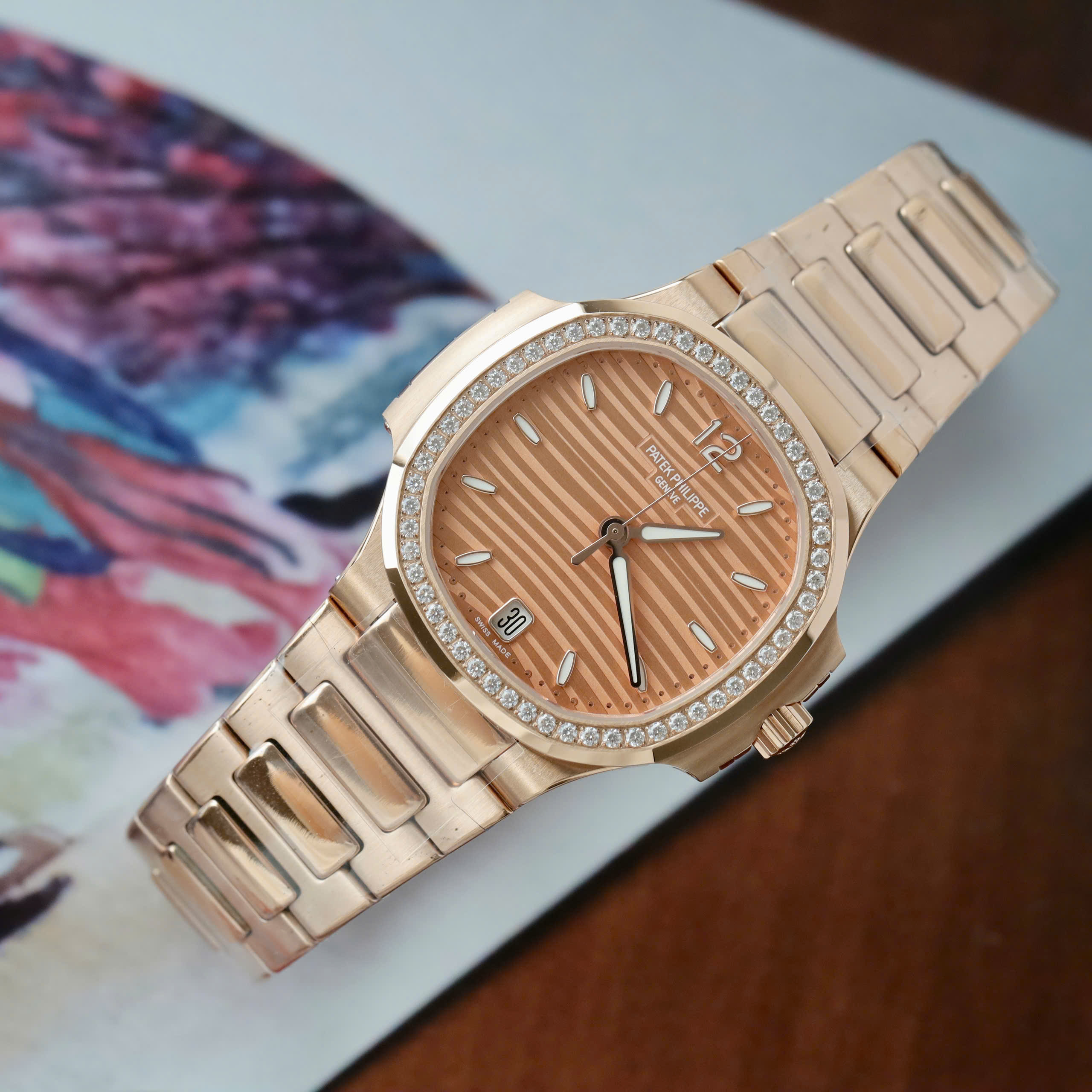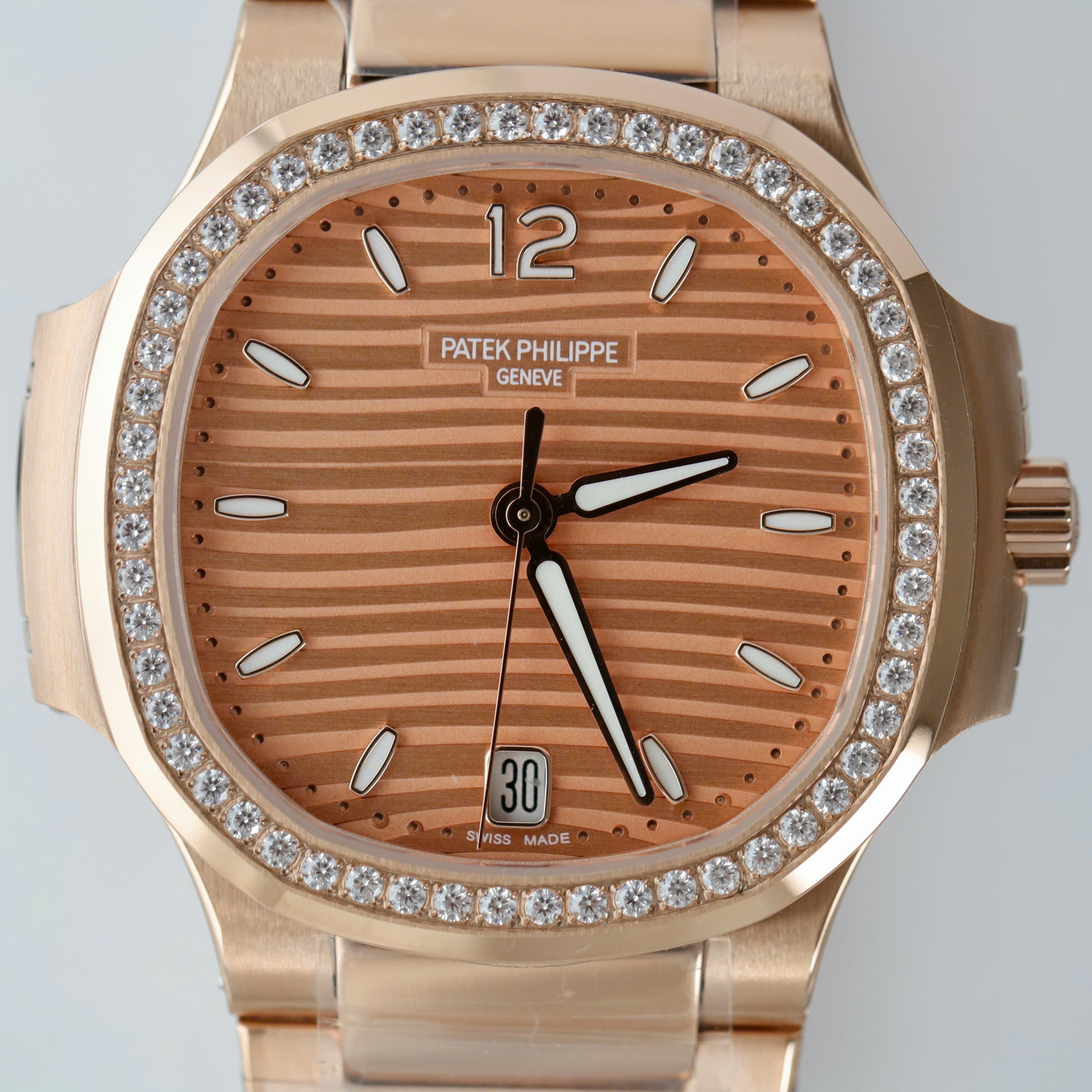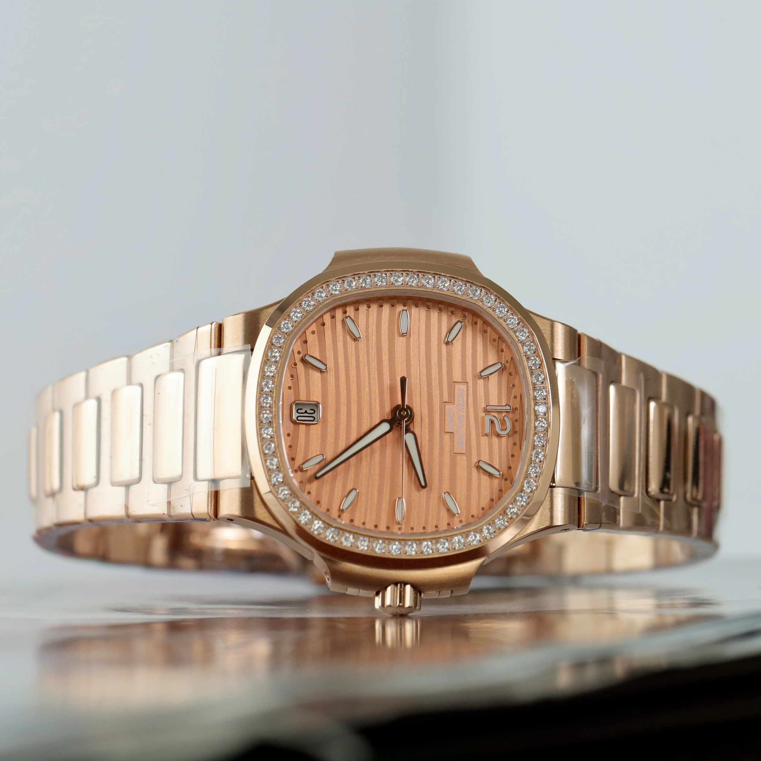 Đồng hồ nữ Patek Philippe Nautilus 7118 Replica 11 mạ vàng hồng viền đính đá nhà máy GR 35.2mm