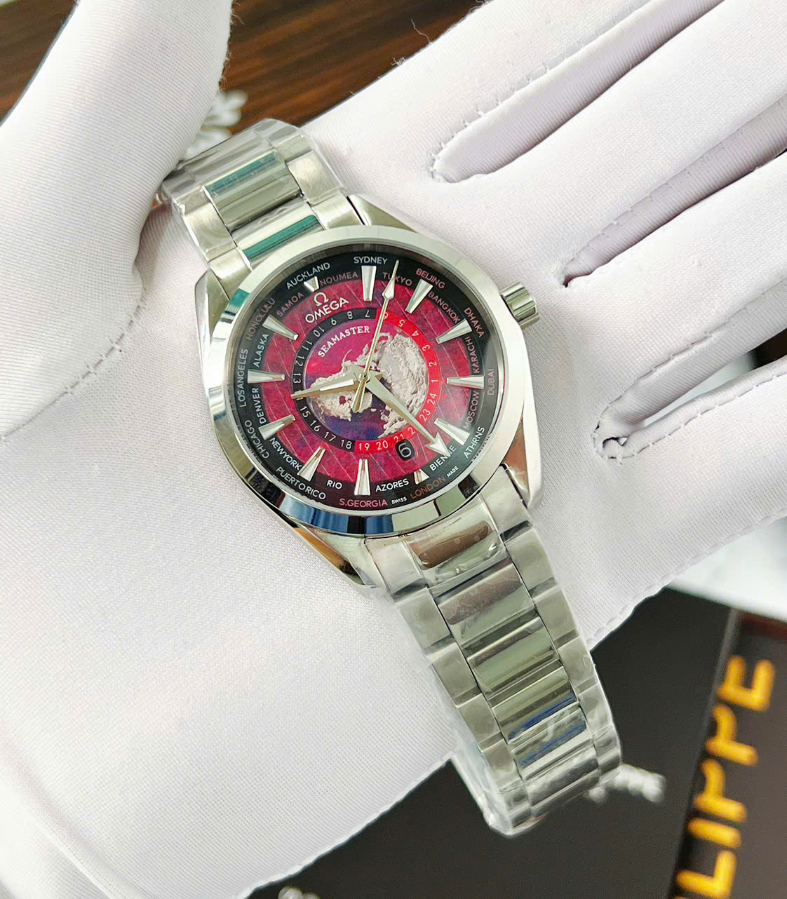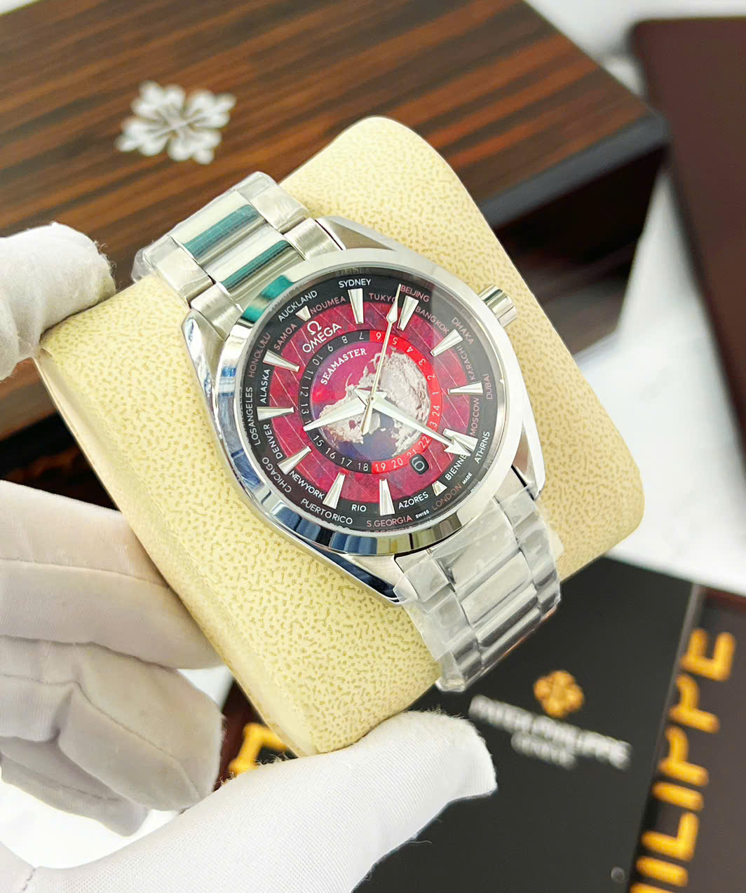 Đồng Hồ Omega Seamaster nam dây kim loại mặt bản đồ đỏ fake cao cấp 42mm