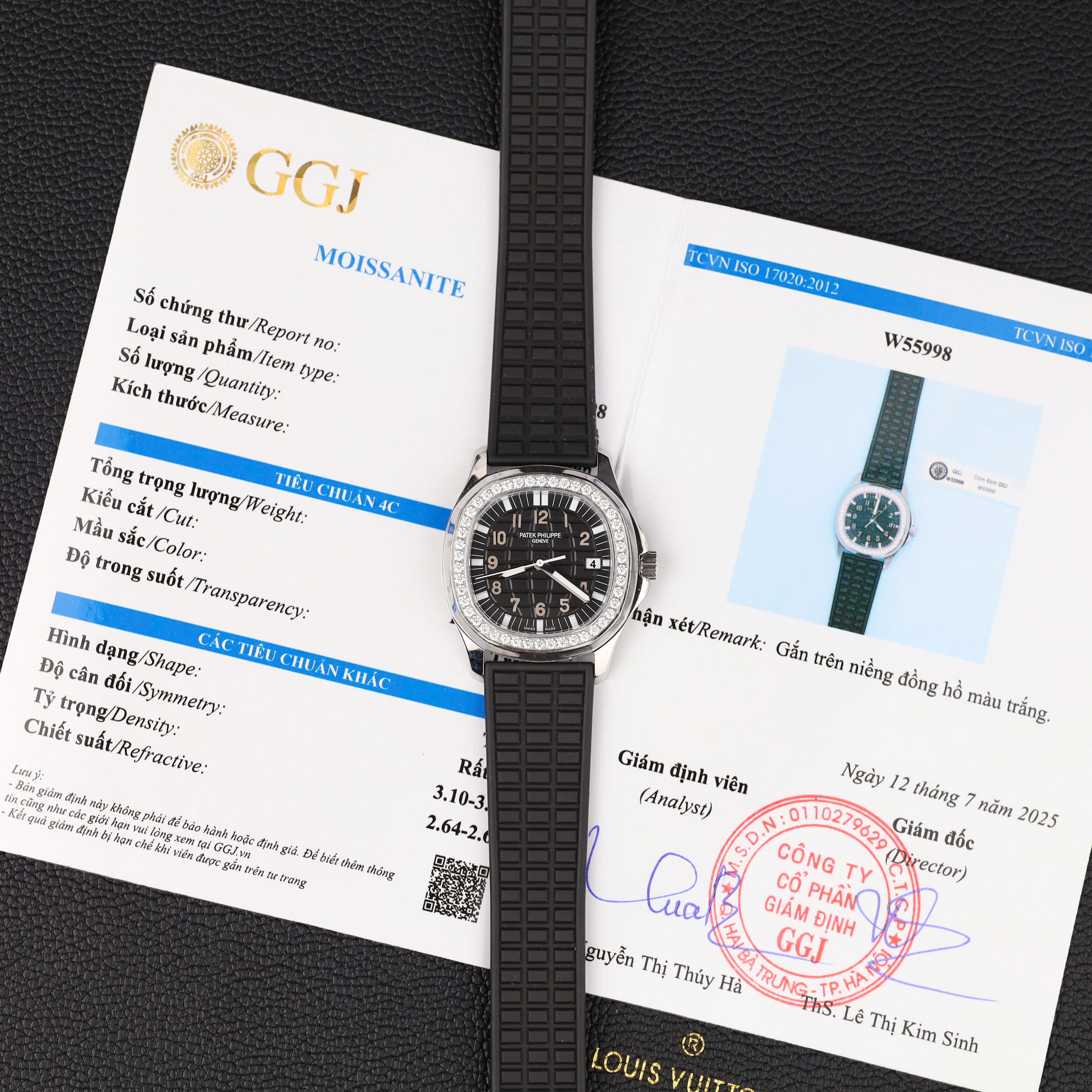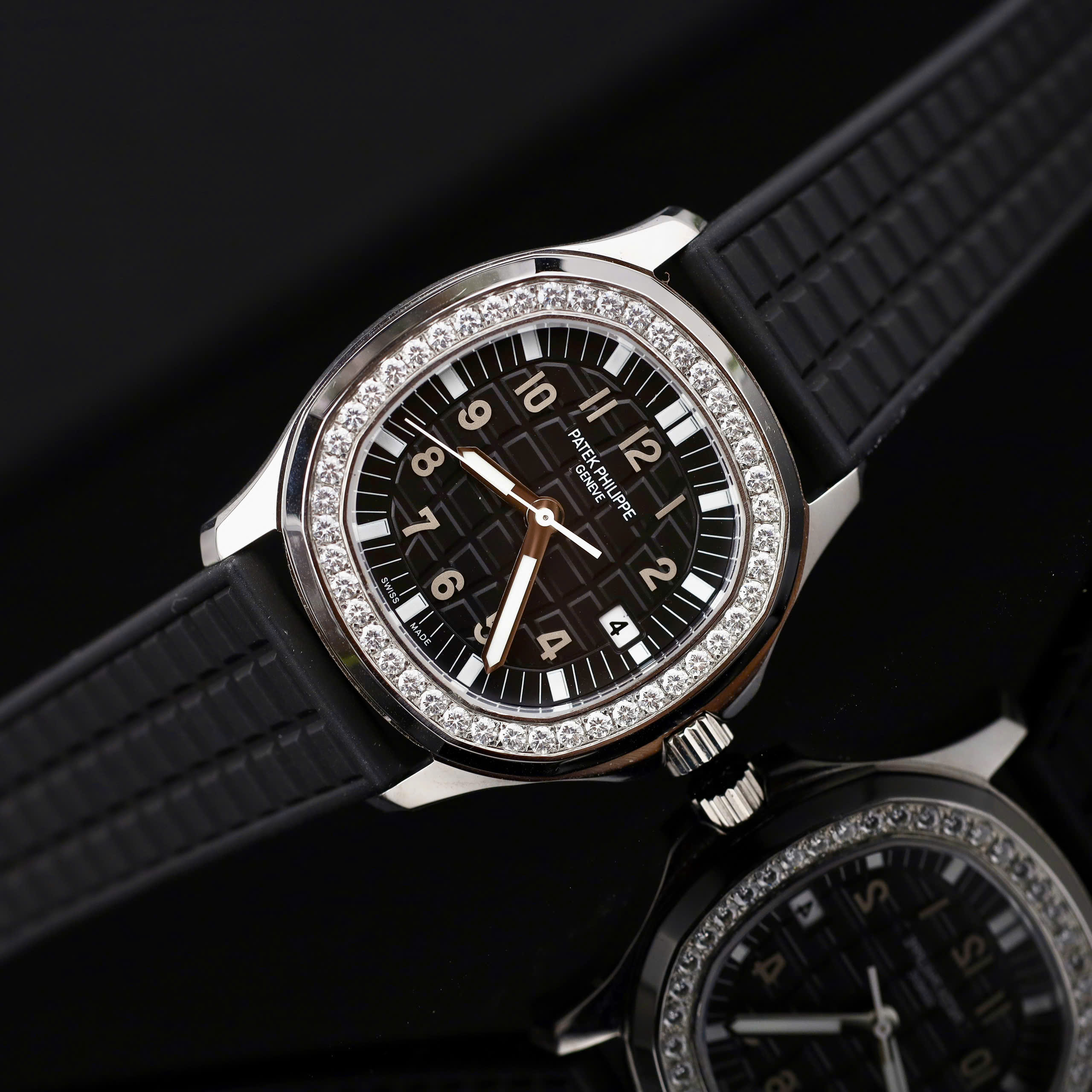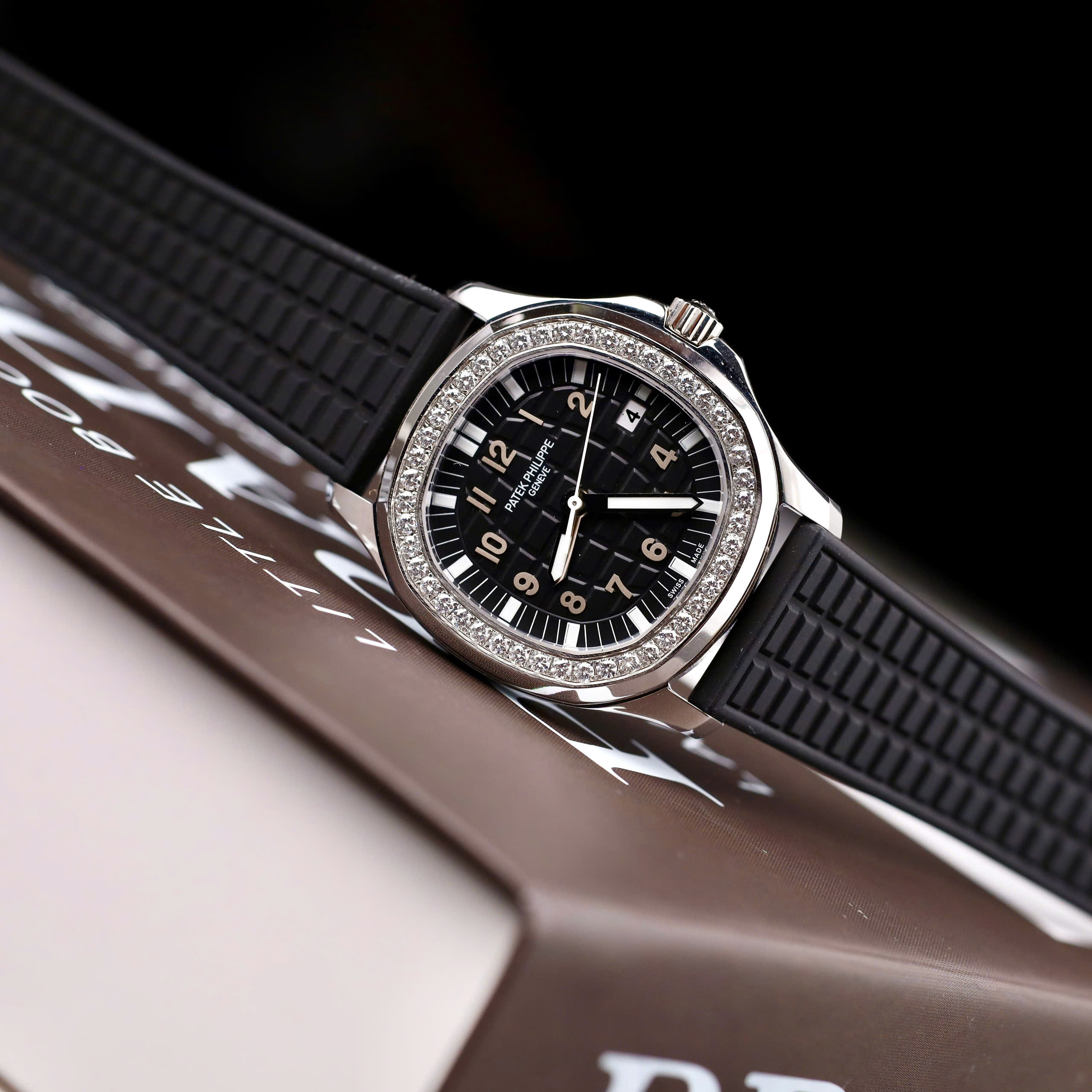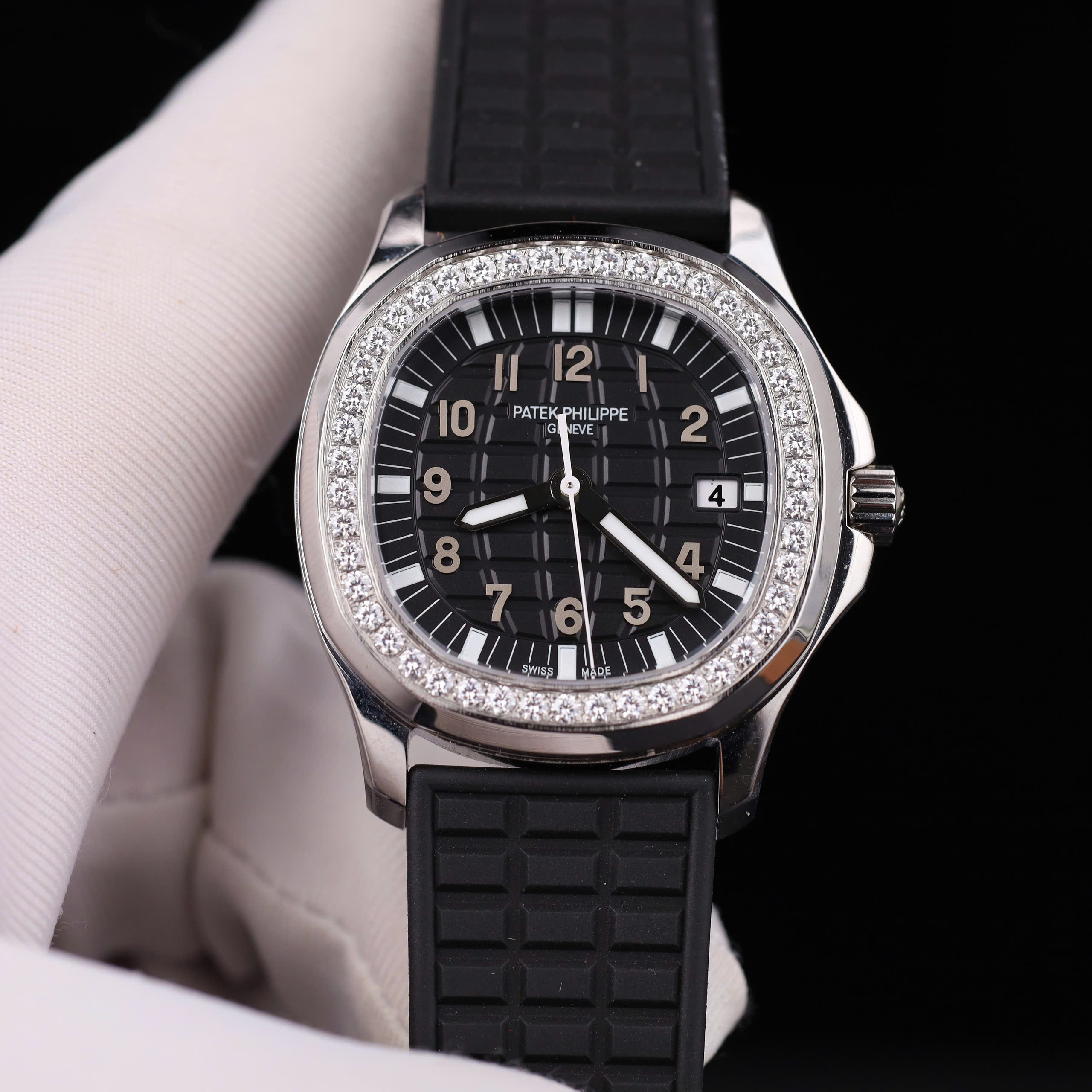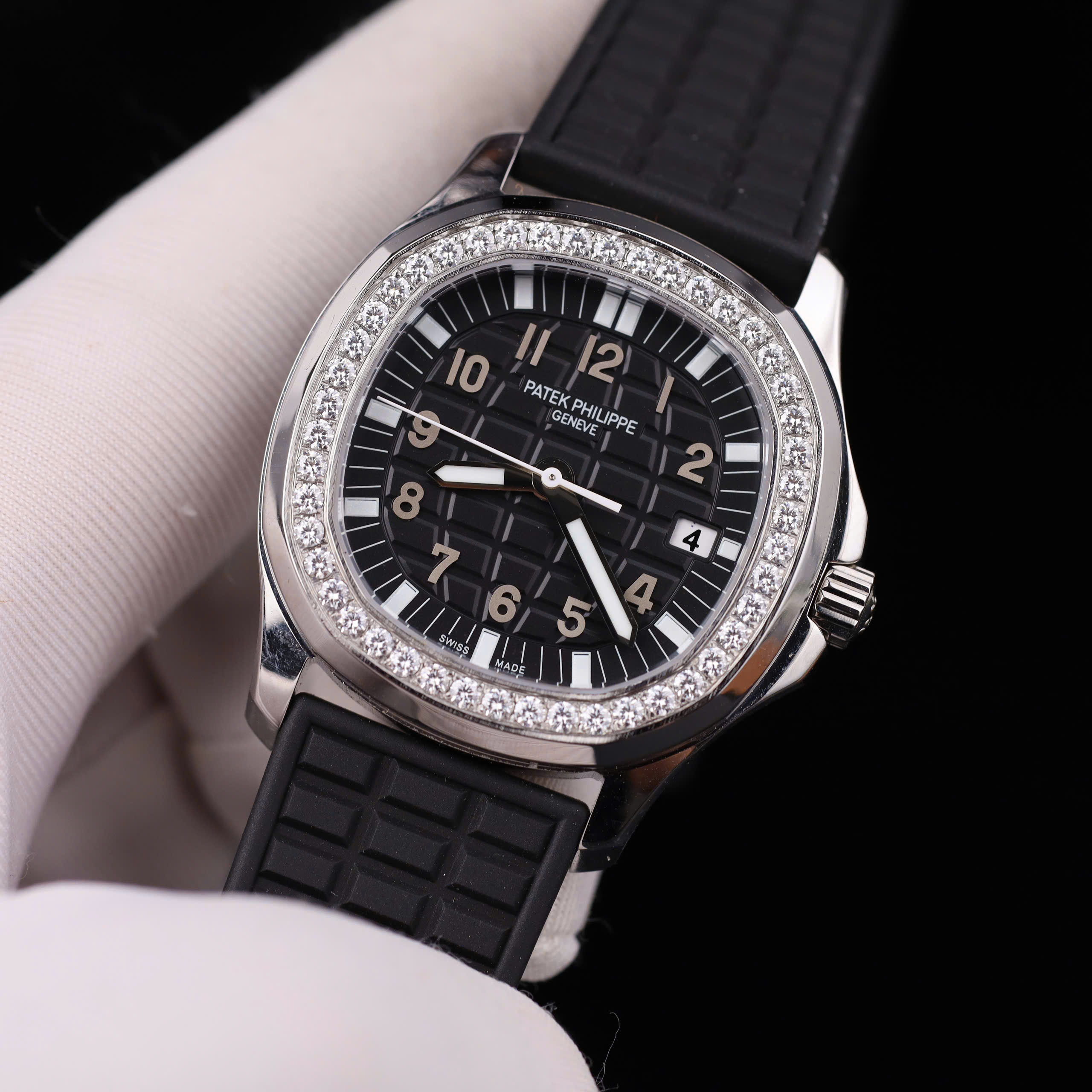 Patek Philippe Aquanaut 5067 Replica Watches Black Dial Bezel Moissanite Diamonds 35.6mm