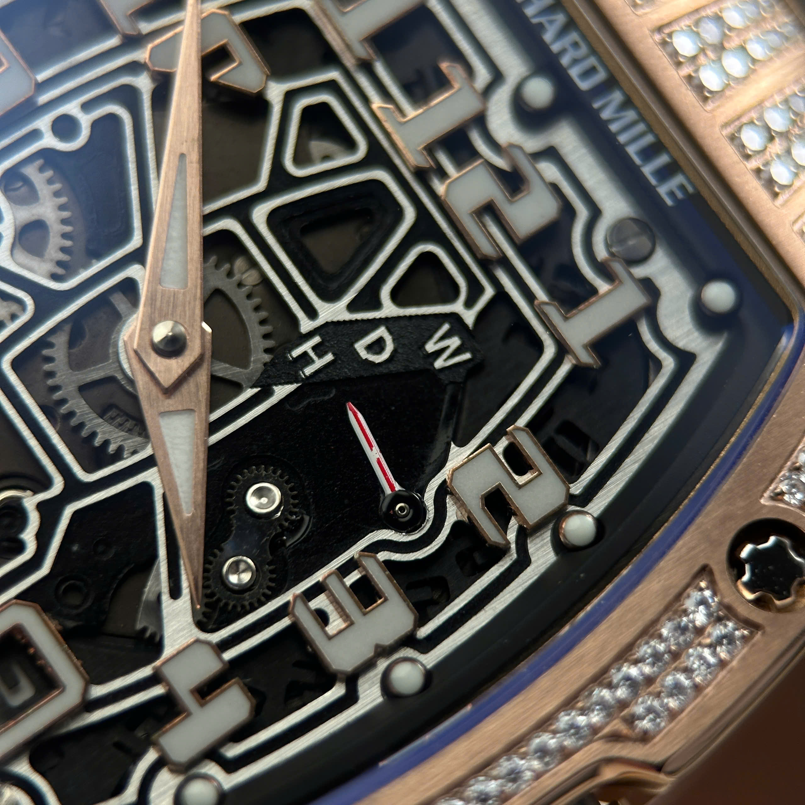 Richard Mille RM67-01 Luxury Fake Watches Case Rose Gold Full Moissanite Diamonds Custom 38.7×47.5mm
